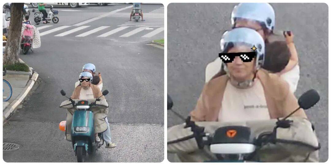 违法行为:骑行非机动车违反规定载人,同时非机动车乘坐人员未按规定佩戴安全头盔。