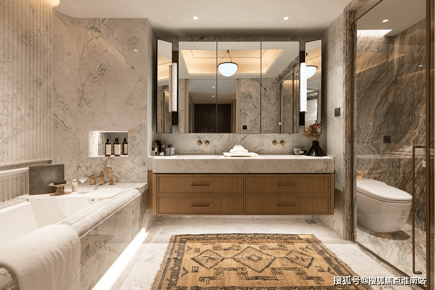 ,空间包含双开门+独立玄关+男女双衣帽间+迷你吧+卫生间+梳妆台书房,面积50余平,这种尺度感和舒适感在市面上非常少见。