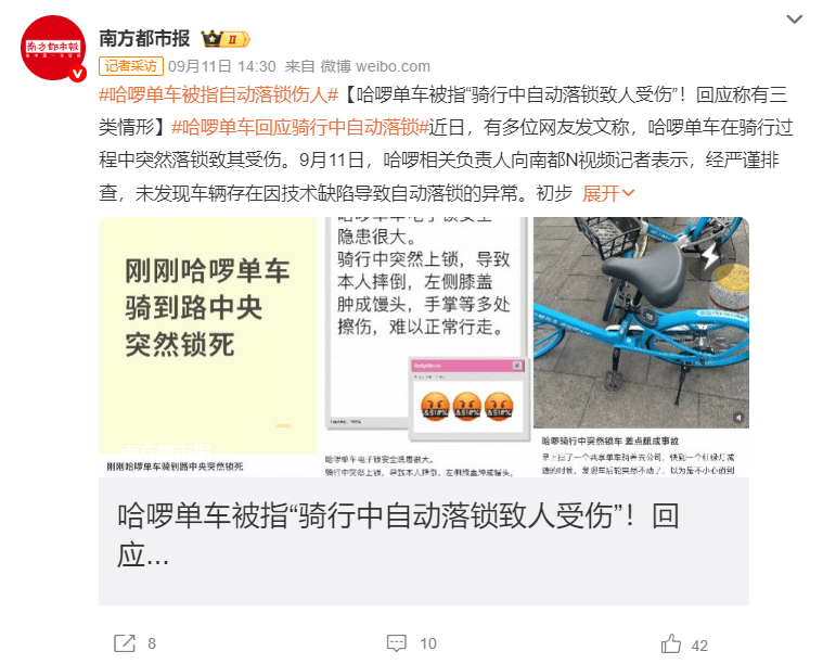 与此同时,哈啰单车还曾因骑行中落锁致人受伤。今年9月,来自上海、北京、广东等多地的多名用户反映碰到了在骑行过程享单车疑似突然落锁的情况。其中,也包括哈啰单车。