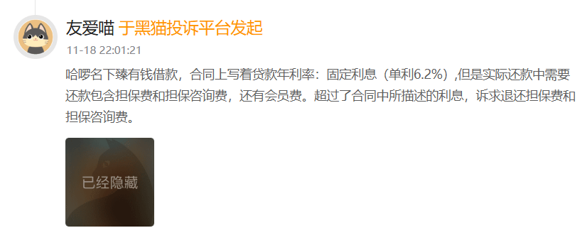 11月18日,一用户投诉称,其在哈啰名下臻有钱借款,合同上写着贷款年利率为固定利息(单利6.2%),实际还款还包含担保费和担保咨询费及会员费,超过了合同中描述的利息;11月19日,另一位用户表示,其2025年在臻有钱借款,年利率高达36%,其无力偿还后,臻有钱对其进行暴力催收、骚扰甚至威胁,对其生活造成了严重的影响。