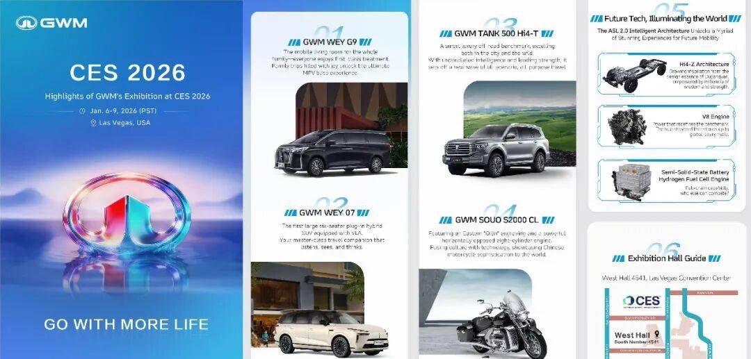 继吉利集团在去年CES展示银河ES8后的车型持续热销,在即将到来的CES展会上吉利汽车必将持续地投入和更深层次讲好智能技术的演进过程。小星猜测或许会集中展示吉利安全中心的多场景仿真实验室。重点呈现通过模拟雨、雪、雷电等264种真实场景来强化全域安全的领先技术,并分享其在AI安全与数据隐私领域获得的多项权威国际认证成果。与此同时,长城汽车将全方位输出其多元化的产品与技术阵列。涵盖魏牌G9豪华MPV、搭载八缸发动机的灵魂摩托车。并将深度解析包括Hi4-Z越野架构、高性能V8发动机、半固态电池及氢燃料电池发动机在内的全链方案。