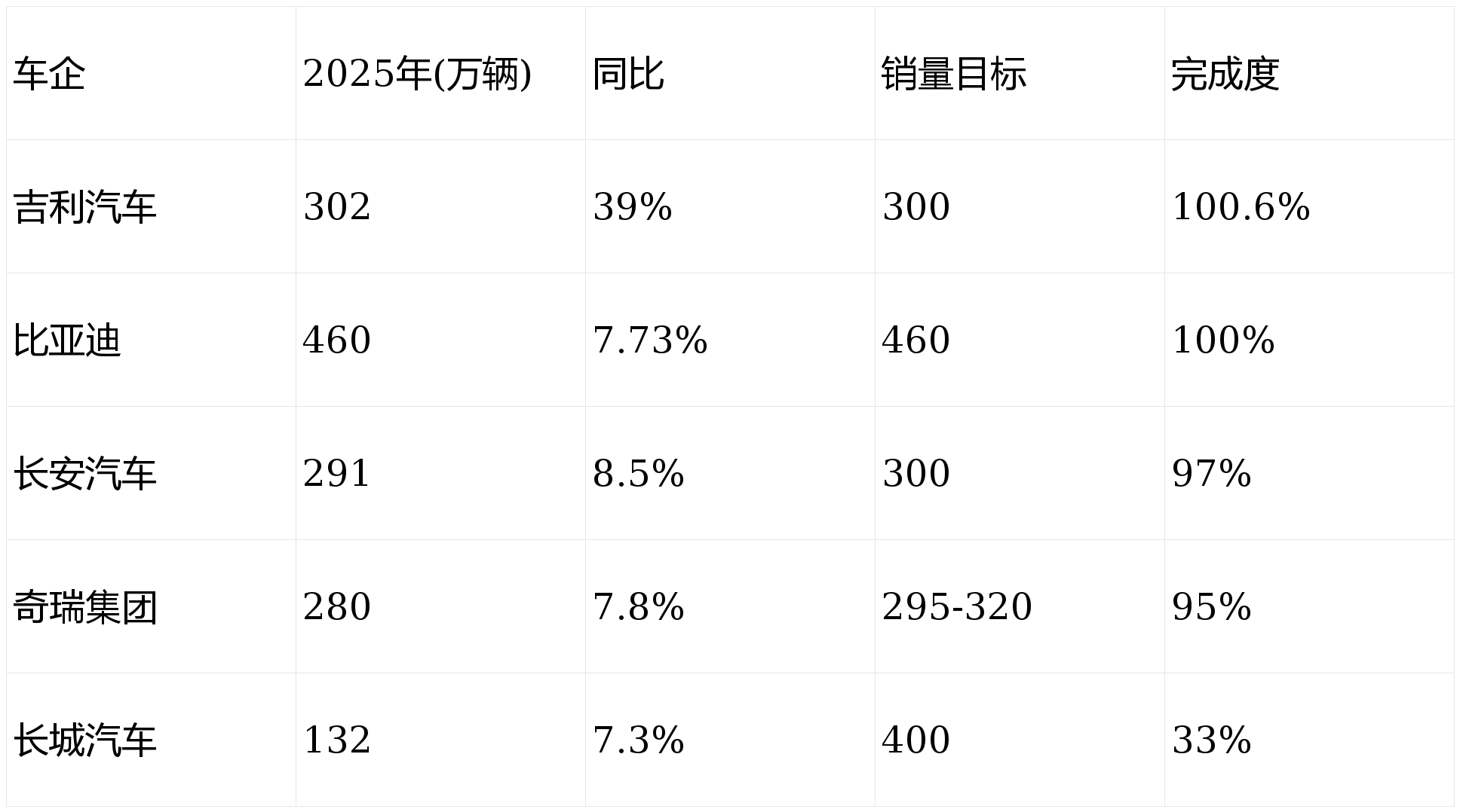 九游娱乐,九游娱乐官网,九游app,九游下载安卓,九游体育,九游,九游下载,九游体育娱乐,九游体育app,九游体育网页版,九游真人,九游棋牌,九游捕鱼,九游娱乐靠谱吗,九游体育官网,九游官网2025年中国车市的年终成绩单出炉:比亚迪年销量达到460万辆,同比增长7.73%有所放缓;吉利汽车302万辆超额完成300万年销量目标,同比猛增39%;长安汽车和奇瑞集团分别实现291万辆和280万辆,同比数据为8.5%和7.8%,年销量完成度皆在95%以上;长城汽车以132万辆的成绩在自主五强中垫底。
