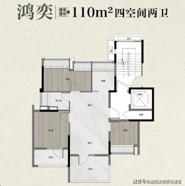 :总价295-320万元,正南朝向,类“四叶草”布局,四房分居四方,互不干扰,私密性极佳,适合三代同堂家庭。
